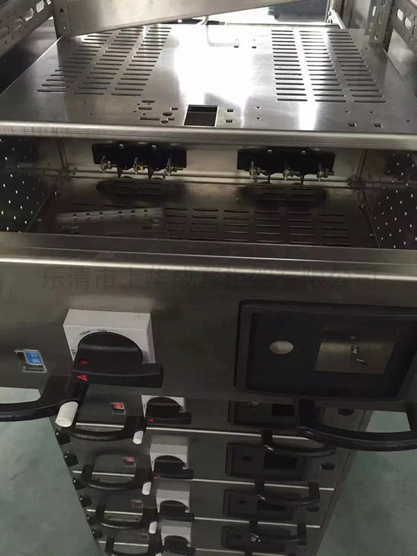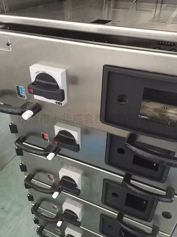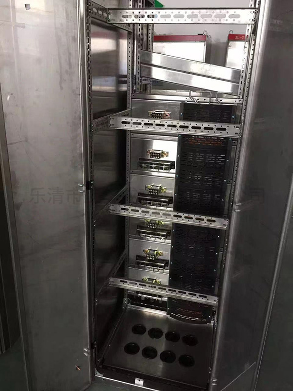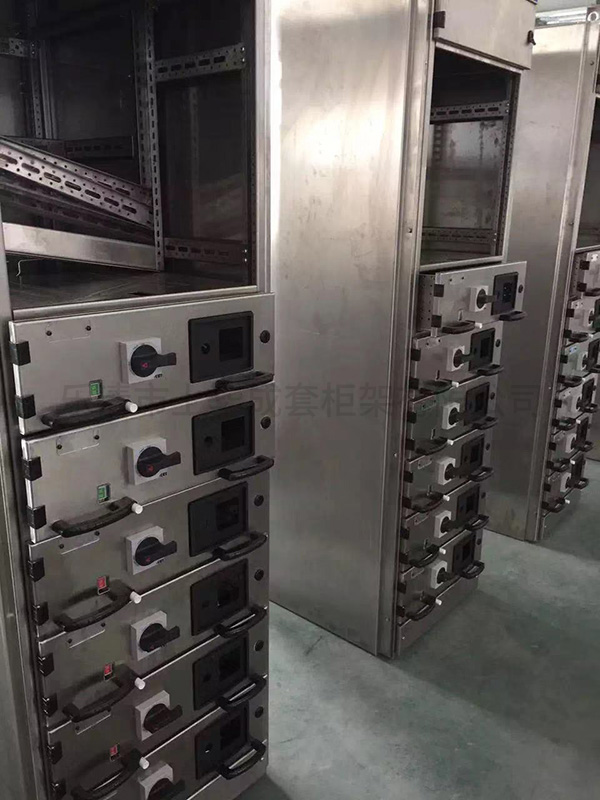 柜體采用組合裝配式結(jié)構(gòu),骨架采用KB型材或不銹鋼型材組裝而成。水平母線放置柜頂,柜頂采用敞開(kāi)式結(jié)構(gòu),頂蓋可開(kāi)啟,柜體裝有后門(mén),出線方式采用后出線,安裝、維修更便捷。抽屜采用開(kāi)門(mén)操作方式。開(kāi)門(mén)操作時(shí)抽屜采用XJG3(旋轉(zhuǎn)三工位)推進(jìn)機(jī)構(gòu)和BPT(撥把三工位)及DJG1-1G(旋轉(zhuǎn)三工位)推進(jìn)機(jī)構(gòu)。一次插件采用新型無(wú)活門(mén)方式,可靠性更高。單元回路可實(shí)現(xiàn)額定電流630A及以下方案,其中1/2單元抽屜電流可達(dá)到125A,1/4.63A。柜體防護(hù)等級(jí)IP4X。